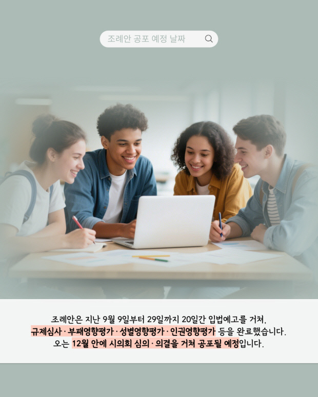 조례안은 지난 9월 9일부터 29일까지 20일간 입법예고를 거쳐, 규제심사·부패영향평가·성별영향평가·인권영향평가 등을 완료했습니다. 오는 12월 안에 시의회 심의·의결을 거쳐 공포될 예정입니다.