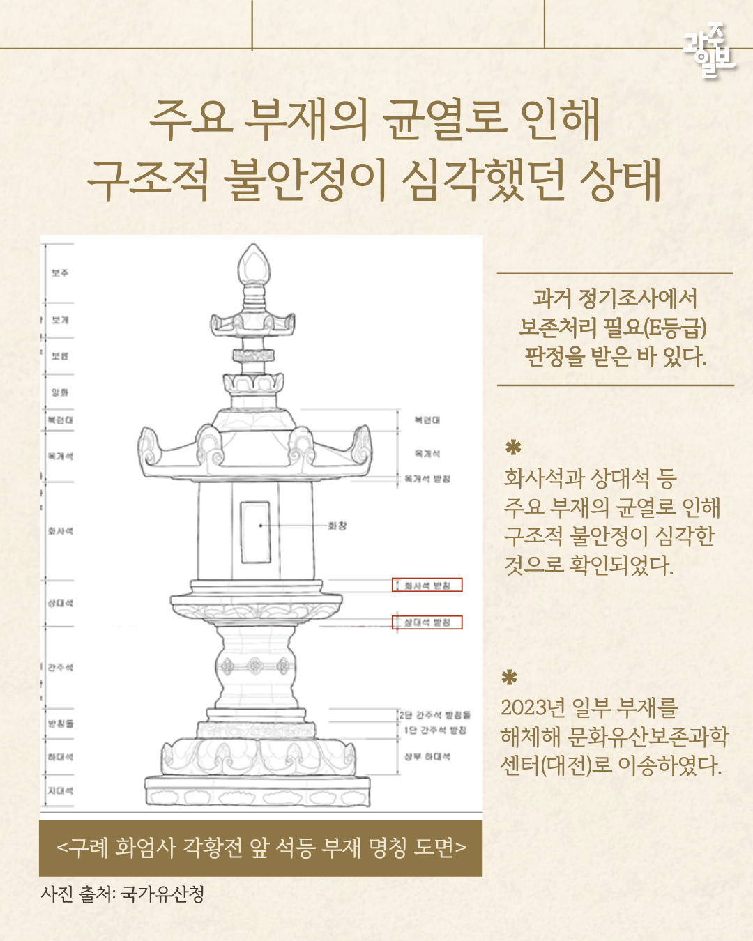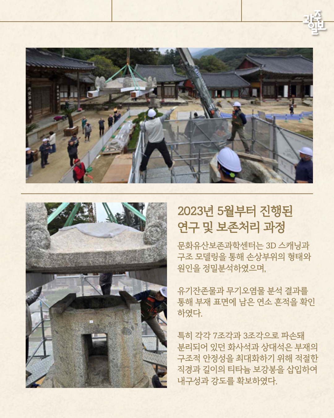 석등은 과거 정기조사에서 화사석과 상대석 등 주요 부재 균열이 화인돼 안정성에 대한 문제가 제기됐다. 이에 따라 문화유산보존과학센터는 정밀 보존처리를 위해 센터로 이송, 지난 2023년 일부 부재를 해체했다. 당시 문화사석과 상대석이 각각 7조각, 3조각으로 분리돼 있는 것을 확인했다. 센터는 다각도의 분석 결과 티타늄 보강봉을 삽입해 내구성과 강도를 높였다.