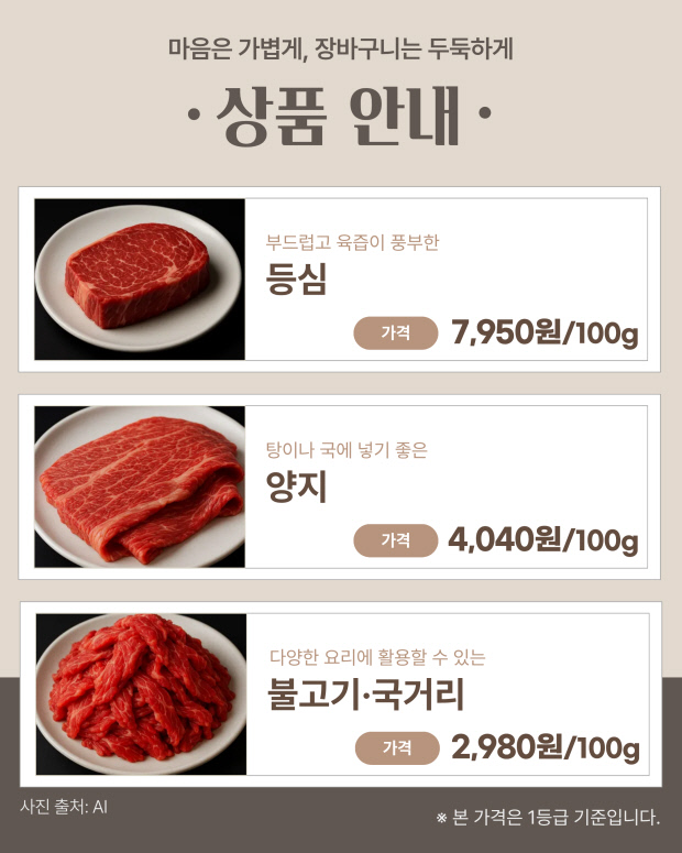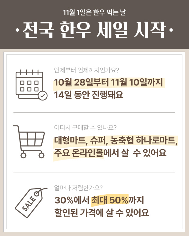 이번 행사는 11월 1일 ‘한우 먹는 날’을 기념하여 개최되며, 할인대상 품목은 소비자 선호도가 높은 등심을 비롯해 양지·설도 등 불고기·국거리류로 1+등급에서 2등급까지 다양하게 구성됐다.
