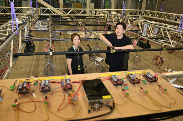 | ACC 창·제작센터 복합 스튜디오에서 신작 ‘경계의 수학’을 준비 중인 ADHD팀 김영은(왼쪽)·김지하 작가. 수백 개의 와이어와 조명, 모터가 얽힌 구조물 속에서 빛과 움직임의 질서를 세밀히 조율하고 있다. |