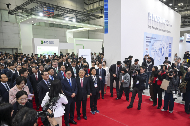 우원식 국회의장을 비롯한 내빈들이 5일 광주시 서구 김대중컨벤션센터에서 열린 ‘BIXPO 2025’ 를 찾아 효성중공업 등 참가 기업들의 설명을 듣고 있다. 국내 최대 규모 에너지 박람회인 BIXPO는 올해 10회를 맞아 ‘에너지를 연결하다’를 주제로 다양한 에너지 혁신 기술을 선보였다./김진수 기자 jeans@kwangju.co.kr