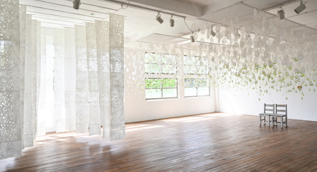 물방울이 맺힌 장면을 표현한 작품은 붓으로 그린 듯 정교하지만 사실은 흰색 한지 섬유만으로 구현한 결과물이다. 또 다른 전시실은 ‘상처와 치유’를 주제로 탈색된 종이를 이용해 생명의 소멸과 소멸 이후의 흔적을 보여주고, 이어지는 공간에서는 ‘생명의 순환’을 콘셉트로 비워지고 해체된 종이에 다시 생명이 피어나는 과정을 담았다. ‘종이가 해체되고 비워져서 섬유 형태로 남은 결과물은 오래된 기억과도 비슷하다’는 말이 어렴풋이 와닿는다. 관람객 중에 작품 앞에서 눈물을 글썽이는 이도 있다고 한다.