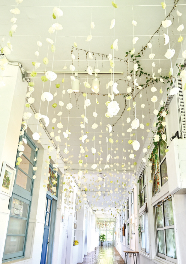 | ‘리:피움’ 미술관 복도에 전시된 강미라 작가의 한지 조형작품. /최현배 기자 |