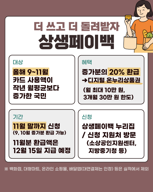 상생페이백’은 올해 9~11월 카드 사용액이 늘어난 국민에게 소비 증가분의 20%를 디지털 온누리상품권으로 환급하는 제도이다.