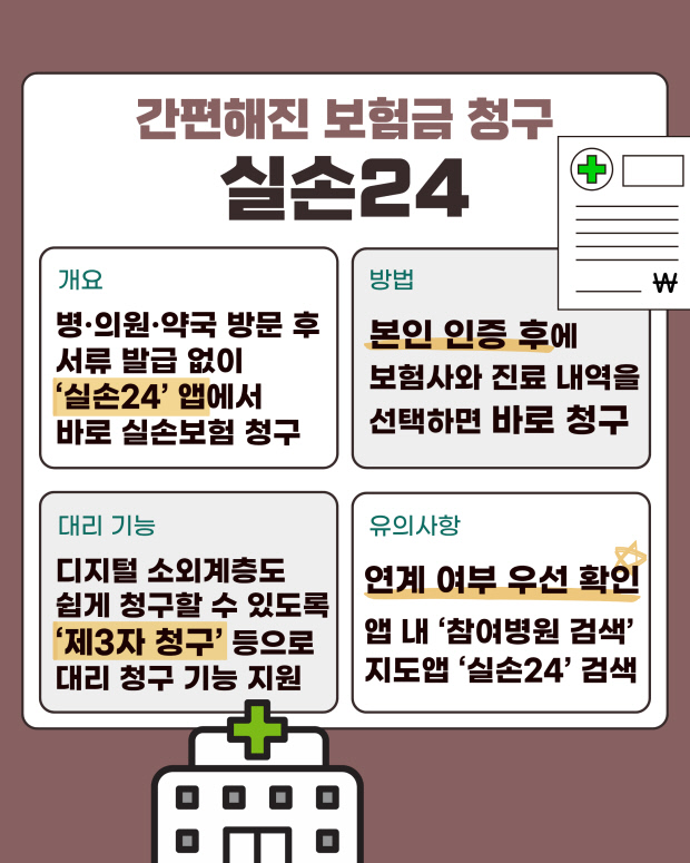 ‘실손24’는 병·의원·약국에서 서류 없이 스마트폰이나 누리집을 통해 실손보험금을 간편하게 청구할 수 있는 서비스이다.