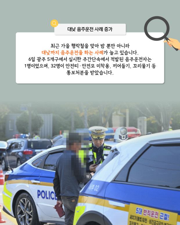 6일 광주 5개구에서 실시한 주간단속에서 적발된 음주운전자는 1명이었으며, 32명이 안전띠·안전모 미착용, 끼어들기, 꼬리물기 등 통보처분을 받았습니다.