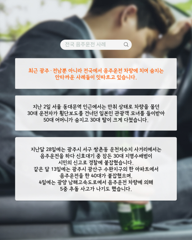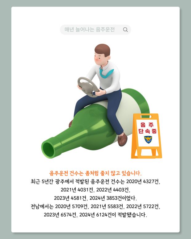 음주운전 건수는 좀처럼 줄지 않고 있습니다. 최근 5년간 광주에서 적발된 음주운전 건수는 2020년 4327건, 2021년 4031건, 2022년 4403건, 2023년 4581건, 2024년 3853건이었습니다. 전남에서는 2020년 5709건, 2021년 5583건, 2022년 5722건, 2023년 6574건, 2024년 6124건이 적발됐습니다.