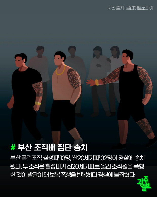 부산 폭력조직 ‘칠성파’ 13명, ‘신20세기파’ 32명이 경찰에 송치됐다. 두 조직은 칠성파가 신20세기파로 옮긴 조직원을 폭행