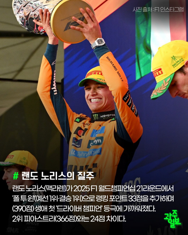 랜도 노리스(맥라렌)가 2025 F1 월드챔피언십 21라운드에서 ‘폴 투 윈’(예선 1위·결승 1위)으로 랭킹 포인트 33점을 추가하며(390점) 생애 첫 ‘드라이버 챔피언’ 등극에 가까워졌다. 2위 피아스트리(366점)와는 24점 차이다.