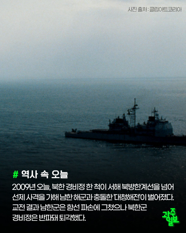 2009년 오늘, 북한 경비정 한 척이 서해 북방한계선을 넘어 선제 사격을 가해 남한 해군과 충돌한 ‘대청해전’이 벌어졌다. 교전 결과 남한군은 함선 파손에 그쳤으나 북한군 경비정은 반파돼 퇴각했다.
