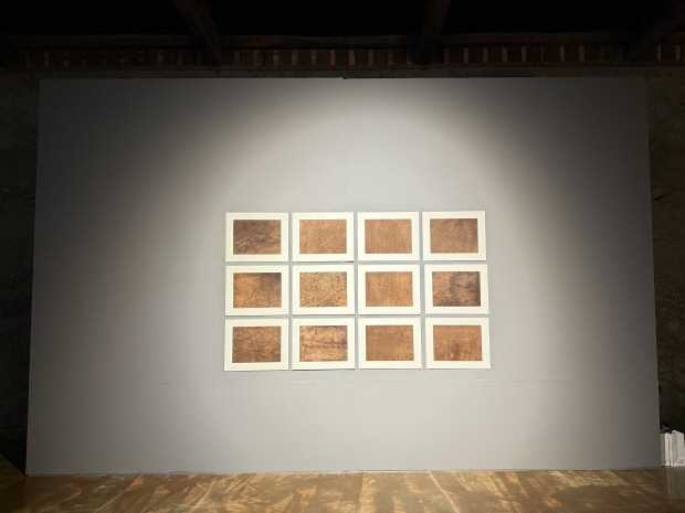 가장 먼저 시선을 사로잡는 작품은 전희경 작가의 ‘Mud Drawing’. 가로 8m, 세로 3.5m에 이르는 대형 설치작으로, 길게 잇댄 장지와 캔버스 천 위에 증도의 갯벌 펄을 입혔다. 작품 뒤편에서 비추는 은은한 빛이 작품을 투과하며 마치 해가 떠오르는 이른 새벽의 갯벌을 보는 듯한 풍경을 만든다.