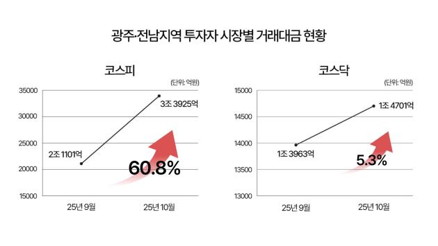 11일 한국거래소 코스닥시장본부 광주혁신성장센터가 발표한 ‘2025년 10월 광주·전남지역 상장법인 증시동향’에 따르면 지난달 광주·전남지역 투자자들의 주식 거래대금은 4조 8626억원으로 전월(3조 5065억원) 대비 1조 3562억원(38.7%) 증가했다. 지역별로 광주가 1조 884억원(44.5%), 전남은 2677억원(25.2%) 늘었다.