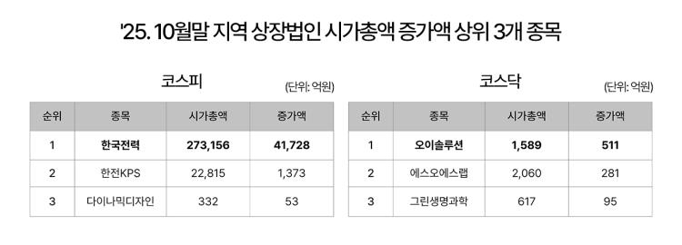10월 말 기준 지역 상장사 시총을 보면 한전이 27조 3156억원으로 4조 1728억원 올라 가장 큰 상승폭을 보였다. 이어 한전KPS(1373억원), 오이솔루션(1589억원), 에스오에스랩(281억원), 그린생명과학(95억원) 등도 순으로 시총 증가액이 컸다.
