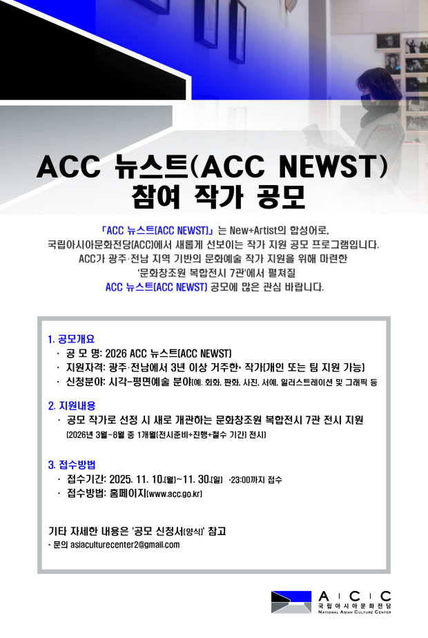 ACC는 내년 1월 복합전시7관을 문화창조원 내 새로 개관해 지역 예술인들을 위한 다양한 전시를 진행한다. 이와 맞물려 창작지원 프로그램인 ‘2026 ACC 뉴스트(NEWST)’에 참여할 전시 작가를 30일까지 공모한다.