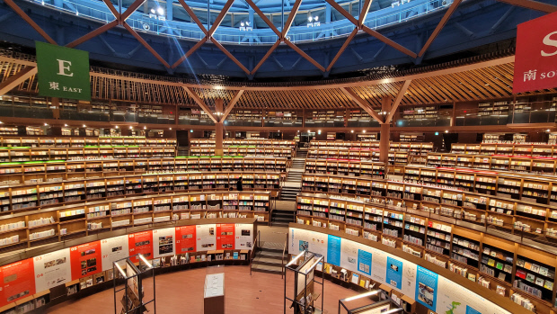 천장 없이 4층까지 툭 터진 중앙의 원형 열람공간은 동서남북 네 구역으로 나눠 소장 도서 30만권 중 7만권을 엄선해 전시중인데 아이를 키우다, 일을 생각하가, 호기심을 품다, 살아가는 방법을 배우다, 마을의 은혜·문화의 향기-이시카와 컬렉션 등 책을 12가지 테마로 나눠 배치한 점이 눈길을 끈다. 500개의 열람석은 도서관 구석구석에 배치돼 있고 도서관을 360도로 바라볼 수 있는 구름다리에 서면 ‘책의 바다’에 빠져드는기분이다.