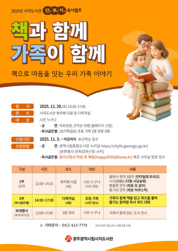 독서골든벨을 원하는 가족은 참가신청서를 전자우편으로 제출하거나 도서관 사무실을 방문해 접수할 수 있으며, 세부 안내는 누리집 공지에서 확인할 수 있다.