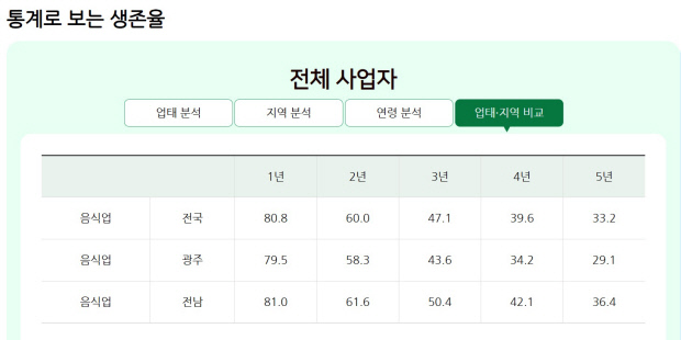지난해 기준 음식점 5년 생존율은 광주 29.1%·전남 36.4%로, 전국 평균 51.6%를 크게 밑돈다. 광주는 17개 시·도 가운데 5년 생존율이 유일하게 30%대에 들지 못하며 전국 꼴찌를 기록했다. 마찬가지로 3년 생존율(43.6%)과 4년 생존율(34.2%) 모두 전국에서 가장 낮았다.