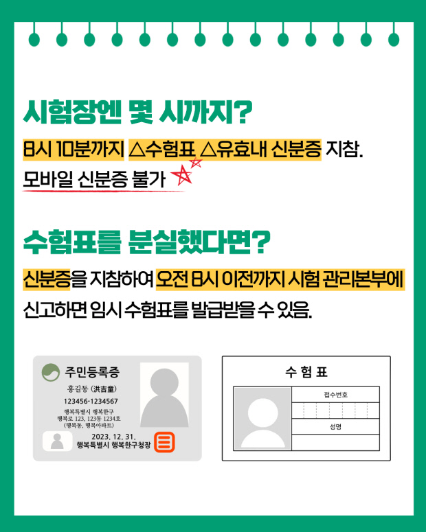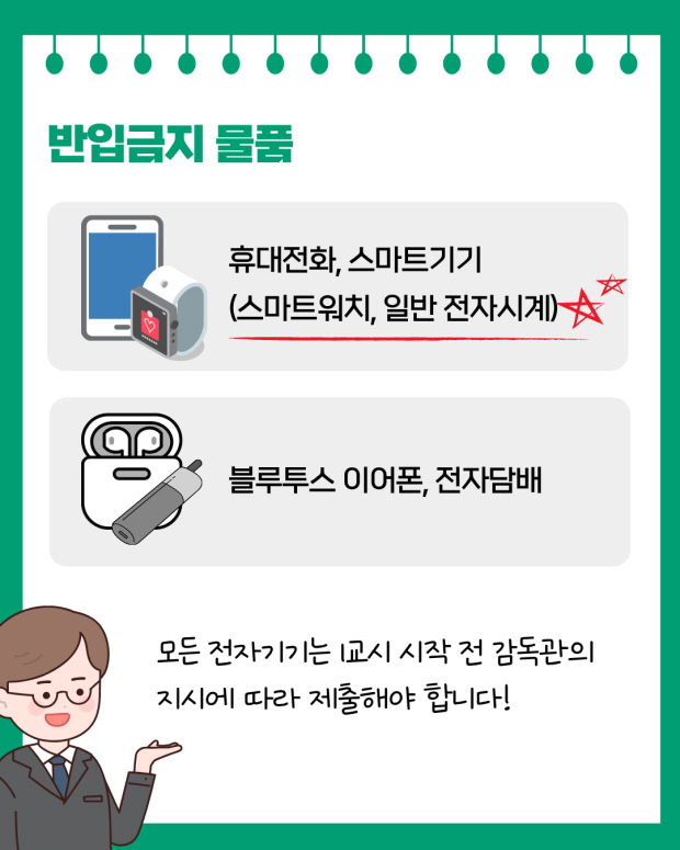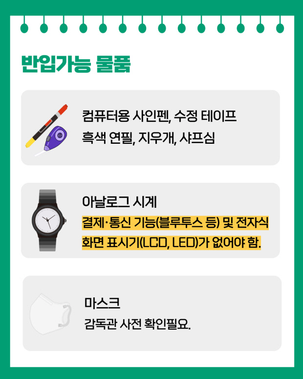 수험생은 오전 8시 10분까지 시험장에 수험표와 유효 내 신분증을 지참하고 입실을 완료해야 한다. 만일 수험표를 분실하거나 챙기지 못한 수험생은 신분증을 지참한 채 오전 8시 이전까지 시험 관리본부에 신고하면 임시 수험표를 발급받을 수 있다.