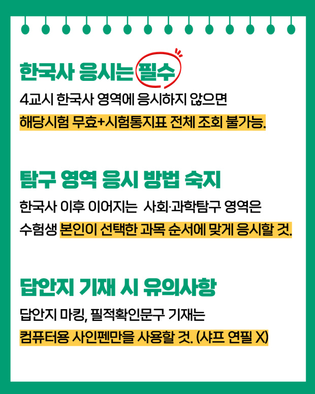 아울러 4교시 한국사 영역에 응시하지 않으면 해당 시험은 무효로 처리되며 시험 통지표 전체 조회가 불가능하다. 이어지는 사회과학탐구 영역에선 수험생 본인이 선택한 과목 순서에 맞게 응시해야 한다.