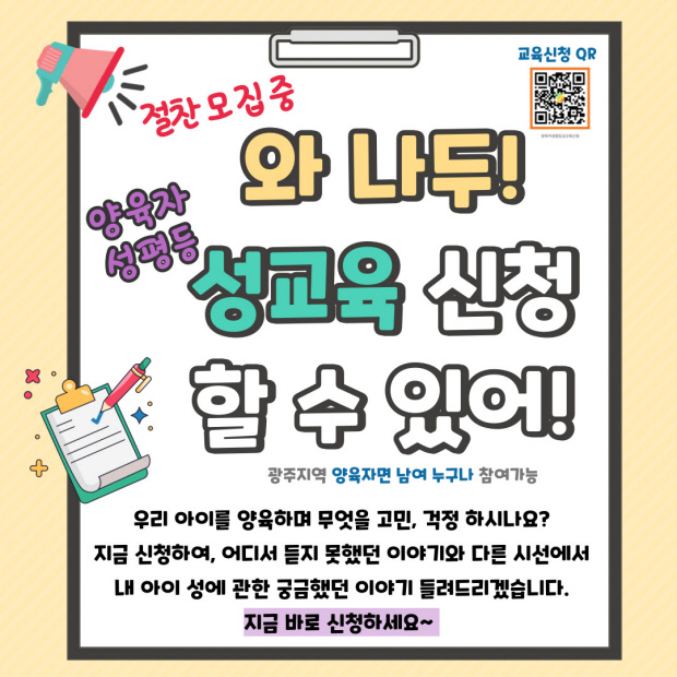 이번 프로그램은 일상에서 마주하는 성 문제를 성인지 감수성의 관점으로 바라보고, 변화한 시대에 맞는 성교육 방향을 함께 고민하는 자리다. 강의는 김항심 모두를 위한 성교육센터 대표와 김연웅 남다른 성교육연구소 총괄사업국장이 맡아 양육 현장에서 활용할 수 있는 실천적 방법들을 대화 형식으로 풀어낼 예정이다.