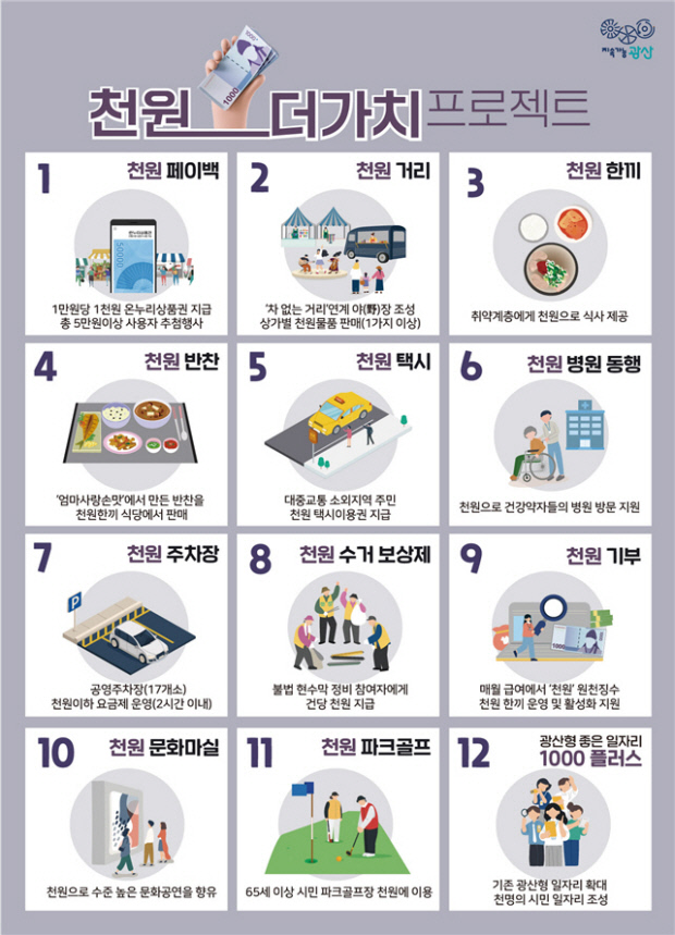 한편 광산구의 ‘천원 더 가치 프로젝트’는 민선 8기 출범 이후 민생대책의 한 축으로 추진 중이며, 천원주차장을 포함해 12개 정책 과제를 발굴해 단계적으로 확대하고 있다.
