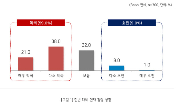 중소기업중앙회(중기중앙회) 광주전남지역본부가 16일 발표한 ‘광주·전남지역 소기업·소상공인 경영환경 애로 조사’에 따르면 59.0%가 ‘전년 대비 경영 상황이 악화됐다’고 답했다. 세부적으로 매우 악화가 21.0%, 다소 악화가 38.0%로 나타났다. ‘호전’(다소 호전 8.0%·매우 호전 1.0%)이라고 답한 이들은 9.0%로 극소수에 불과했다.