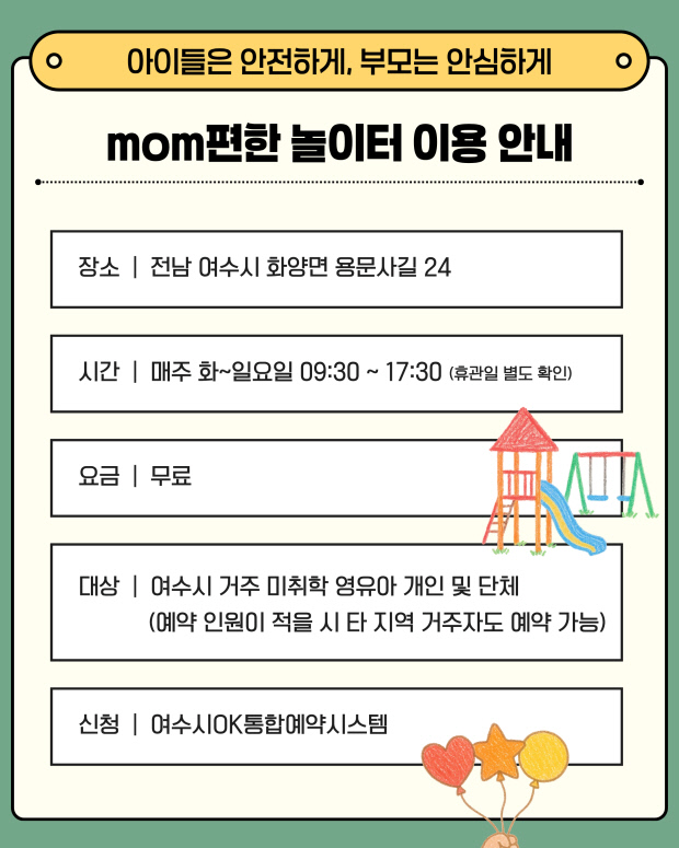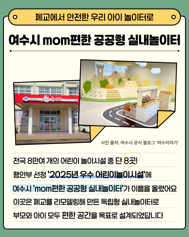전국 8만 4000여 개의 어린이놀이시설 중 전문가 심사를 거쳐 최종 8곳이 선정됐으며, 전남에서는 ‘여수시 mom편한 공공형 실내놀이터’가 포함되었다.