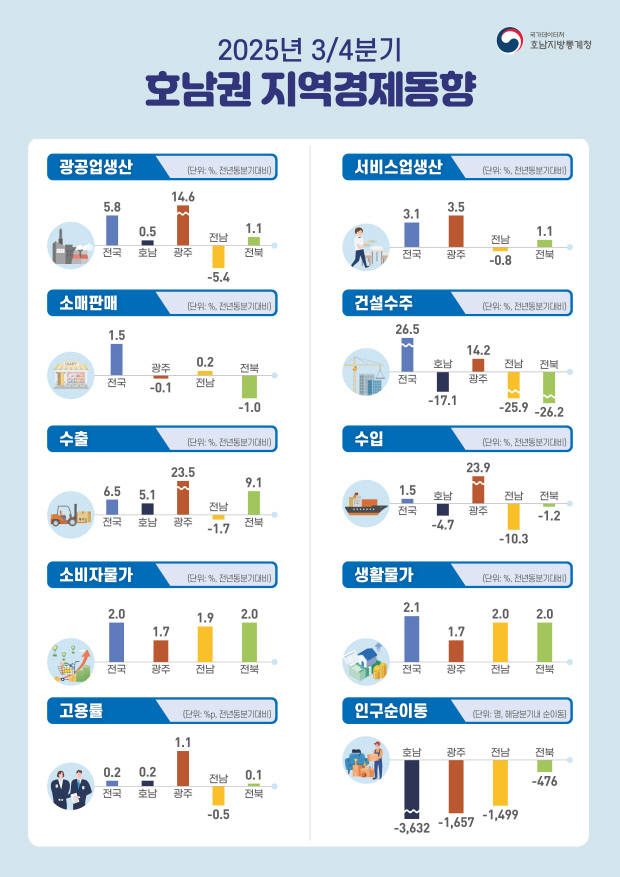 같은 기간 전남은 생산 측면에서 광공업생산과 서비스업 생산이 5.4%, 0.8%씩 감소했고, 수입(-10.3%), 수출(-1.7%), 고용률(-0.5%) 등 경기지표들이 부진했다.