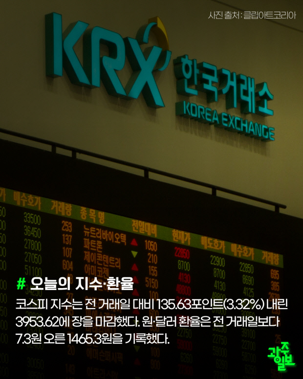 코스피 지수는 전 거래일 대비 135.63포인트(3.32%) 내린 3953.62에 장을 마감했다. 원·달러 환율은 전 거래일보다 7.3원 오른 1465.3원을 기록했다.