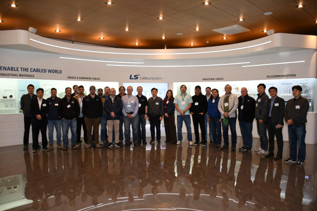 | 한전의 기술 교육에 참가한 미국 주요 전력기업 관계자들이 국내 전력기기 제조사인 LS전선 본사를 방문해 기념촬영을 하고 있다.<한전 제공> |