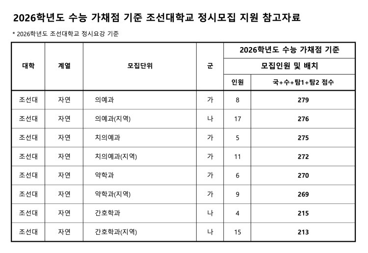 | 2026학년도 수능 가채점 기준 조선대학교 정시모집 지원 참고자료 |