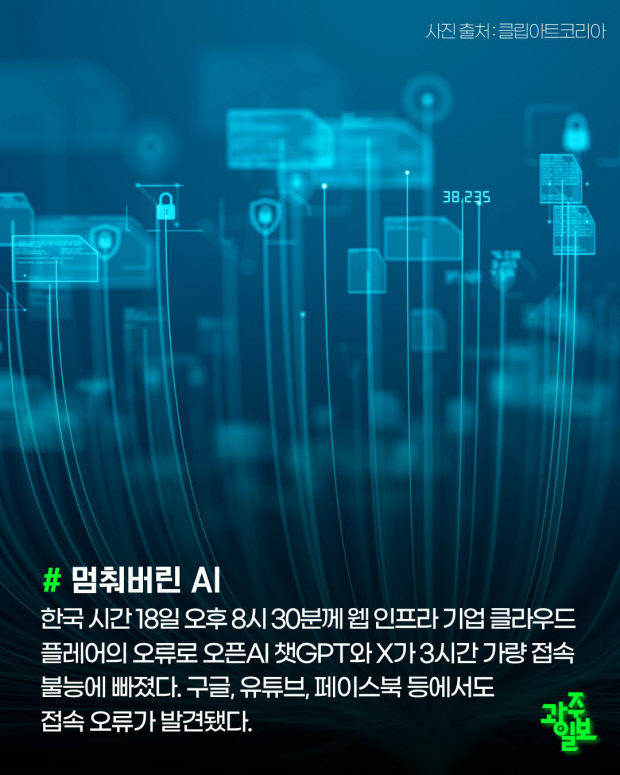 한국 시간 18일 오후 8시 30분께 웹 인프라 기업 클라우드플레어의 오류로 오픈AI 챗GPT와 X가 3시간 가량 접속 불능에 빠졌다. 구글, 유튜브, 페이스북 등에서도 접속 오류가 발견됐다.