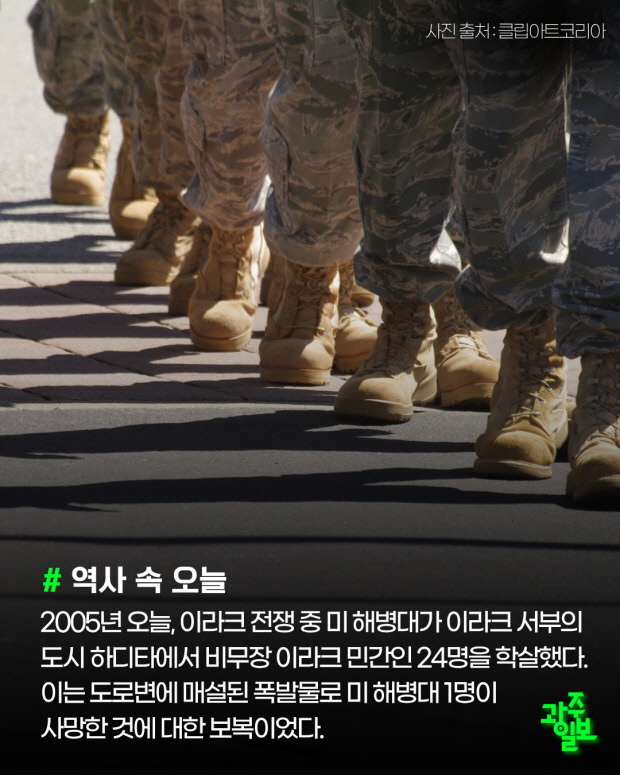 2005년 오늘, 이라크 전쟁 중 미 해병대가 이라크 서부의 도시 하디타에서 비무장 이라크 민간인 24명을 학살했다. 이는 도로변에 매설된 폭발물로 미 해병대 1명이 사망한 것에 대한 보복이었다.