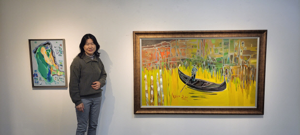 | 작품 앞에서 포즈를 취한 고희자 작가. |