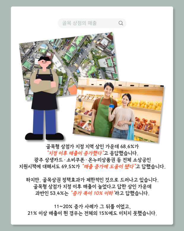 골목형 상점가 지정 지역 상인 가운데 68.6%가 “지정 이후 매출이 증가했다”고 응답했습니다. 광주 상생카드·소비쿠폰·온누리상품권 등 전체 소상공인 지원시책에 대해서도 69.5%가 “매출 증가에 도움이 됐다”고 답했습니다.
