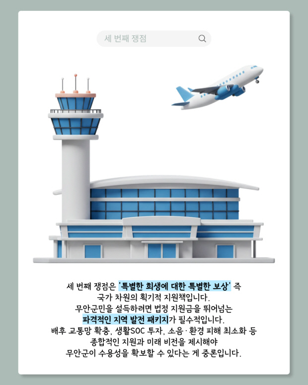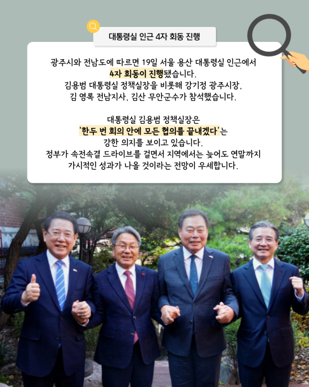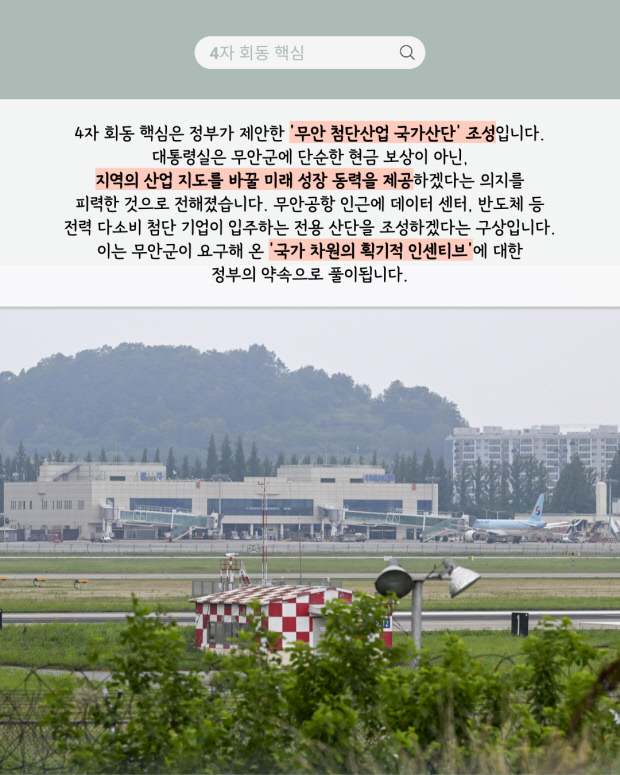 4자 회동의 핵심은 정부가 제안한 ‘무안 첨단산업 국가산단’ 조성입니다. 대통령실은 무안군에 단순한 현금 보상이 아닌, 지역의 산업 지도를 바꿀 미래 성장 동력을 제공하겠다는 의지를 피력한 것으로 전해졌습니다.