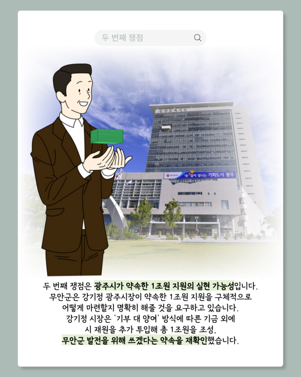 두 번째 쟁점은 광주시가 약속한 1조원 지원의 실현 가능성입니다. 강기정 시장은 ‘기부 대 양여’ 방식에 따른 기금 외에 시 재원을 추가 투입해 총 1조원을 조성, 무안군 발전을 위해 쓰겠다는 약속을 재확인했습니다.