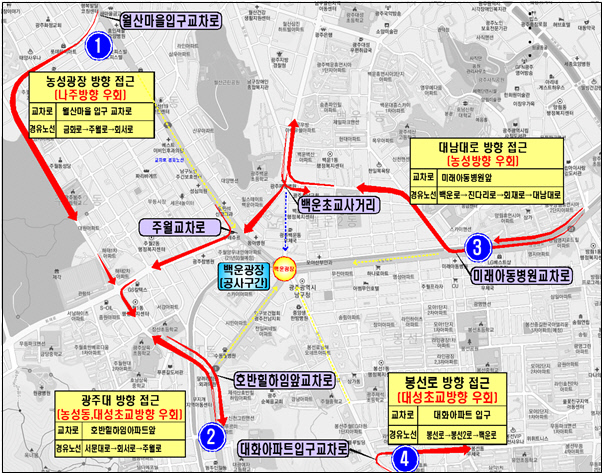 남광주 일대에서 백운광장으로 향하는 차량은 미래아동병원 교차로에서 기독병원과 수피아여고 방향으로, 봉선동에서 백운광장을 목표로 하는 차량은 대화아파트 입구 교차로에서 봉선중앙로와 봉선초교 방향으로 우회하도록 안내된다.