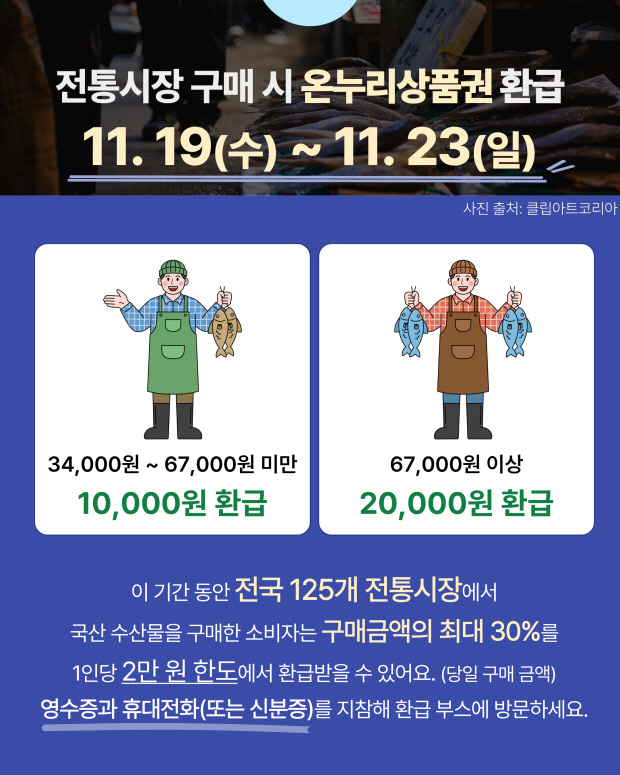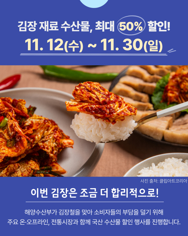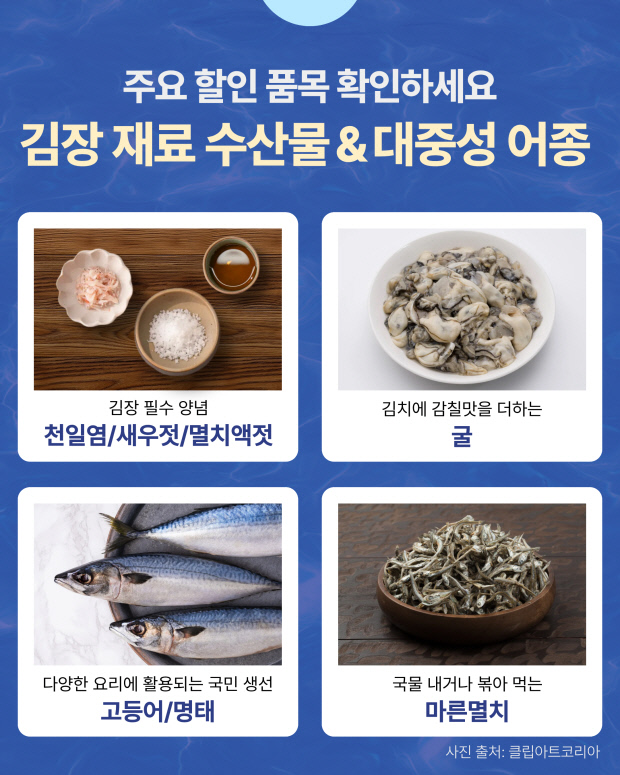 소비자들은 행사 기간 국산 수산물을 최대 50%까지 할인받아 구매할 수 있다. 행사 품목은 천일염·새우젓·멸치액젓·굴 등 주요 김장재료와 명태·고등어·마른멸치 등 대중성 어종이다.