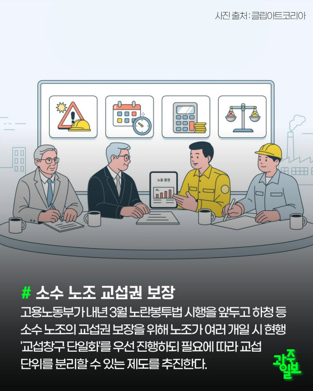 고용노동부가 내년 3월 노란봉투법 시행을 앞두고 하청 등 소수 노조의 교섭권 보장을 위해 노조가 여러 개일 시 현행 ‘교섭창구 단일화’를 우선 진행하되 필요에 따라 교섭단위를 분리할 수 있는 제도를 추진한다.