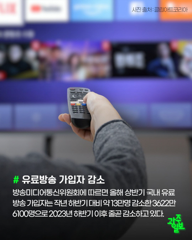 방송미디어통신위원회에 따르면 올해 상반기 국내 유료방송 가입자는 작년 하반기 대비 약 13만명 감소한 3622만6100명으로 2023년 하반기 이후 줄곧 감소하고 있다.
