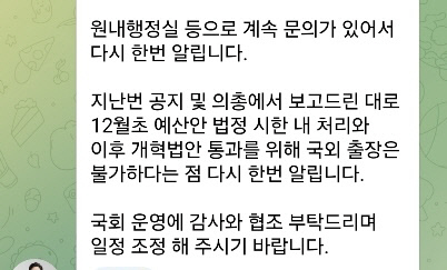 24일 민주당 원내 지도부 한 인사는 “최근 2차례 거쳐 민주당 의원 전체에게 해외 출국을 금지하고 12월 국회에 집중하라는 문자메시지를 공개적으로 전달했다”고 밝혔다.