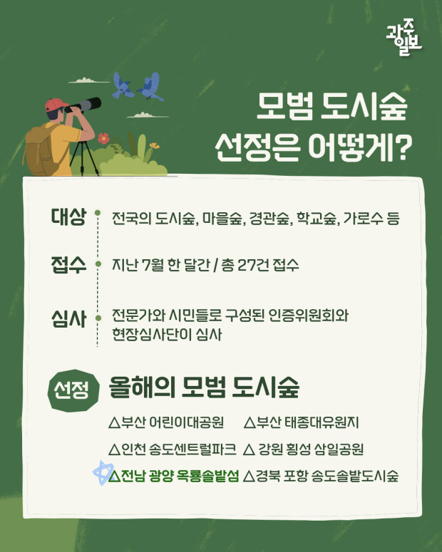 올해의 모범 도시숲은 ▲부산 어린이대공원 ▲부산 태종대유원지 ▲인천 송도센트럴파크 ▲강원 횡성 삼일공원 ▲전남 광양 옥룡솔밭섬 ▲경북 포항 송도솔밭도시숲이다.