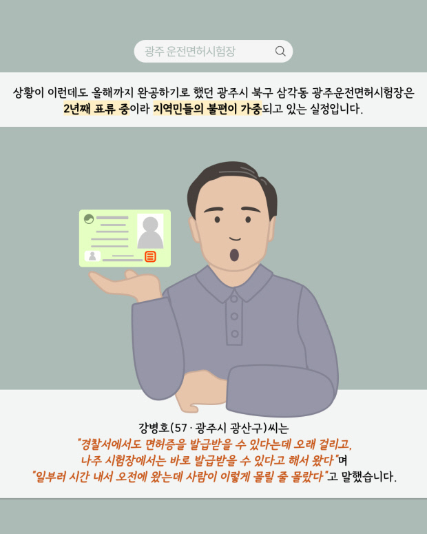 상황이 이런데도 올해까지 완공하기로 했던 광주시 북구 삼각동 광주운전면허시험장은 2년째 표류 중이라 지역민들의 불편이 가중되고 있는 실정입니다.