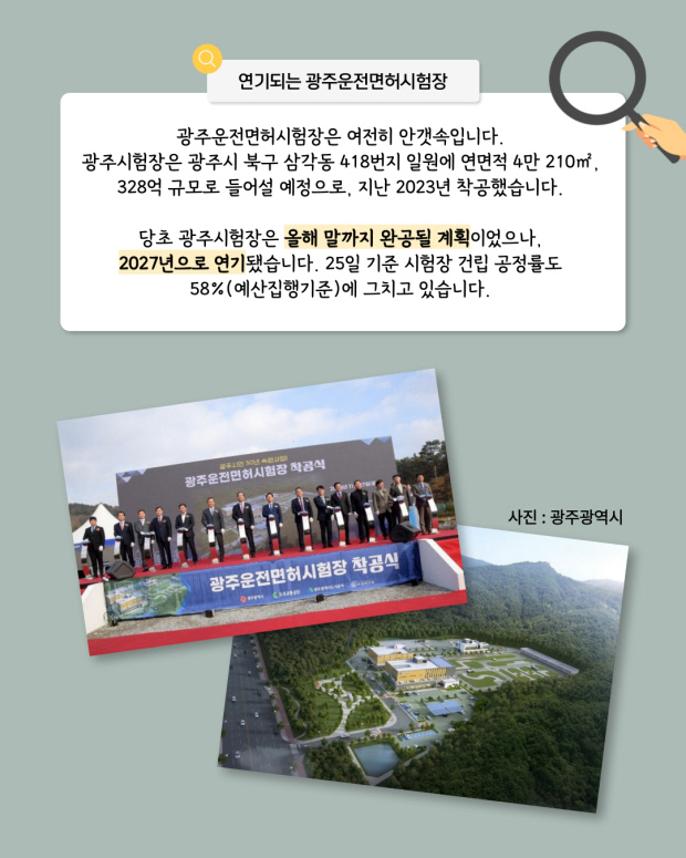 당초 광주시험장은 올해 말까지 완공될 계획이었으나, 2027년으로 연기됐습니다. 25일 기준 시험장 건립 공정률도 58%(예산집행기준)에 그치고 있습니다.
