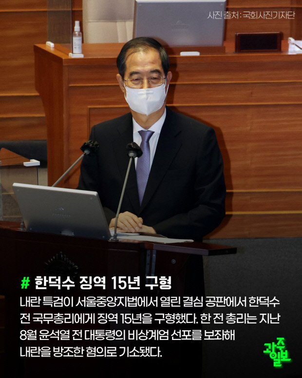 내란 특검이 서울중앙지법에서 열린 결심 공판에서 한덕수 전 국무총리에게 징역 15년을 구형했다. 한 전 총리는 지난 8월 윤석열 전 대통령의 비상계엄 선포를 보좌해 내란을 방조한 혐의로 기소됐다.