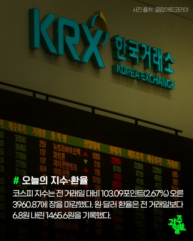 코스피 지수는 전 거래일 대비 103.09포인트(2.67%) 오른 3960.87에 장을 마감했다. 원·달러 환율은 전 거래일보다 6.8원 내린 1465.6원을 기록했다.