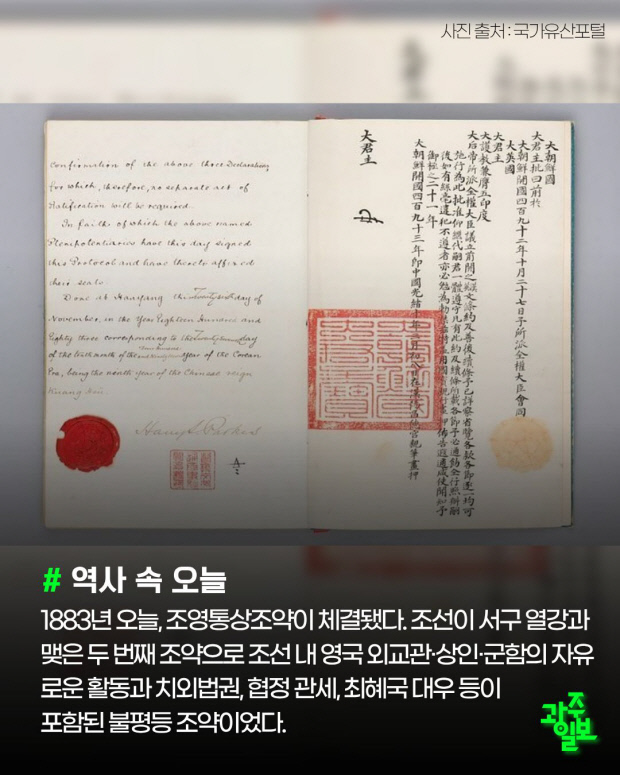 1883년 오늘, 조영통상조약이 체결됐다. 조선이 서구 열강과 맺은 두 번째 조약으로 조선 내 영국 외교관·상인·군함의 자유로운 활동과 치외법권, 협정 관세, 최혜국 대우 등이 포함된 불평등 조약이었다.