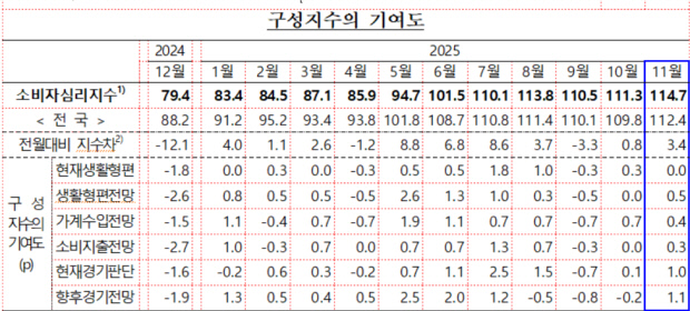 26일 한국은행 광주전남본부가 발표한 ‘2025년 11월 광주·전남지역 소비자동향조사’에 따르면 광주·전남 CCSI는 이달 기준 114.7로 전월(111.3) 대비 3.4포인트(p) 상승했다.