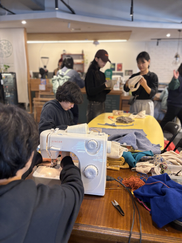 | ‘한번 더 캠페인:쓰레기 없는 친환경 프로젝트’ 중 수선 워크숍 ‘안 입는 스웨터 어떻게 살려볼까?’ 행사 모습. |